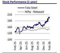 We upgraded Tata Steel (TATA) to BUY in Oct’25 at INR177 and reiterated our positive stance on the name in our detailed steel thematic report in Jan’26. While the stock has performed well after our upgrade, we remain constructive on the stock on the back of a strong domestic demand outlook, safeguard duty-led price support, ongoing capacity expansions and a gradual turnaround in the EU business.