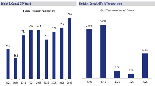 * H&P growth recovery driven by key international markets: TBO’s consol. GTV grew 12.1% YoY (+9.6% QoQ) to INR 89bn in 2QFY26, in line with JMFe. Segment-wise, H&P GTV grew 20.4% YoY from 12.5%/17.4% in 1QFY26/2QFY25, respectively, whereas Air ticketing GTV was flattish YoY vs. low-teens decline in the prior 2 quarters. H&P segment in turn saw broad-based improvement in trends across key international markets, particularly Europe (+20% YoY), MEA (+27% YoY) and APAC (+41% YoY). Other markets, the US, LATAM and India grew 16%, 10% and 4%, respectively. Consol. revenue grew 25.9% YoY to INR 5.67bn, a beat on JMFe/ Cons. By 2.8%/ 4.9% respectively, aided by the H&P (+34.3% YoY) segment that reported better-than expected take-rate on account higher share of commission income. While gross take-rates in the H&P segment stood at 8.46% vs. 8.36%/7.59% in 1QFY26/2QFY25, air segment take-rate was 2.41% vs. 2.56%/2.60% in 1QFY26/2QFY25, respectively.