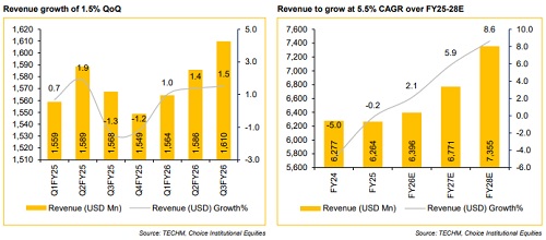 TECHM reported Q3FY26 revenue of USD 1,610 Mn, up 1.7% QoQ in CC. The company posted record quarterly deal bookings of USD 1,096 mn, up 34.3% QoQ and the highest LTM deal wins in five years, well above its USD 600–800 Mn target range. Deal momentum remains strong and well distributed across verticals. Vertical performance was mixed, with Communications (+2.8% QoQ), Manufacturing (+2.2%), and Technology and Healthcare (+3.0% each) showing growth, while BFSI declined 6.2% QoQ. Revenue from USD 20 Mn+ clients continues to outpace the company average, driven by a focus on scaling up strategic accounts and long-term partnerships. Management remains confident of sustaining deal momentum, emphasizing on efforts to convert large deals and expand the number of clients in the USD 20 Mn+ category.