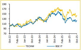 TECHM reported Q2FY26 revenue of USD 1,586 Mn, up 1.6% QoQ in CC terms. TCV stood at USD 816Mn, rising 0.9% QoQ, surpassing the company’s target range of USD 600–800Mn, with deal ins well-distributed across Communications, BFSI, Manufacturing and Retail verticals. Management remains confident of sustaining deal momentum, emphasising on its efforts to convert large deals and expand the number of clients in the USD 20Mn+ category. Among verticals, Communications declined 2.0% QoQ, but is expected to stabilize. While Manufacturing grew 5.3%, BFSI and Retail rose 3.8% and 9.0%, respectively. TECHM is revisiting its three-year strategy amid slower-thanexpected progress, but remains optimistic of a strong FY27 performance.