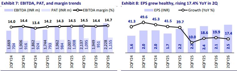 TIME reported an in-line 2Q, with volume growth of 14% YoY and revenue growth of 10% YoY, driven by an 18% YoY growth in value-added products (VAP; 18.7% EBITDA margin). Overseas operations (volume/revenue up 16%/13%; 35% of the mix) outperformed India (volume/revenue up 13%/9%). EBITDA margin came in healthy at 14.7%, and PAT rose 17% YoY to INR1.2b. Established products’ revenue grew 7% YoY and delivered a 13.1% EBITDA margin.