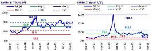 * TTAN, with its superior competitive positioning (in sourcing, studded ratio, youth-centric focus, and reinvestment strategy), continues to outperform other branded players. The brand recall and business moat are not easily replicable; therefore, Tanishq’s competitive edge will remain strong in the category.