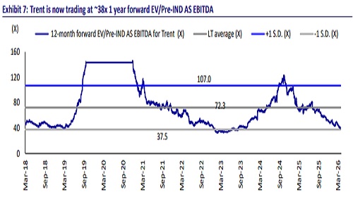 * Despite significant earnings downgrades, we note consensus FY27 EPS estimate is still ~7% ahead of our estimate and could see further downside risks from a) weaker-than-estimate Zudio store additions, and b) higher-than-expected impact from store cannibalization, competition and weaker productivity in lower tier cities.