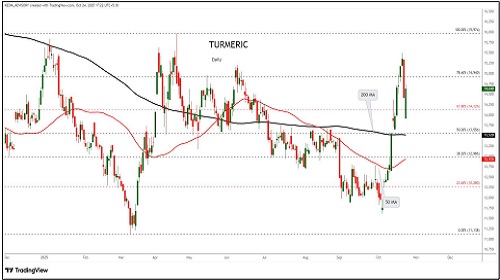 Turmeric trading range for the day is 14520-15660.