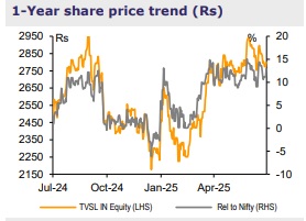 TVSL logged a healthy Q1, with 20% YoY revenue growth and stable margins QoQ at 12.5%, adjusted for the lumpy PLI benefit recognition in Q4FY25. While domestic industry performance was muted in Q1, TVSL expects improvement in Q2, aided by the upcoming festive season and early onset of monsoons – with ongoing improvement in exports markets to continue (including key African markets, where the worst is now behind). TVSL’s enduring outperformance, reflected in the ongoing market-share gains across growth categories (premium motorcycles, scooters, exports, EVs), coupled with the recent and upcoming product actions (eg new E2W, E3W launch, and rollout of superpremium motorcycles under the Norton brand from H2), keep us positive on the stock. We trim FY26E/27E EPS by ~1%/2% and build-in 14%/19%/21% revenue/EBITDA/core EPS CAGR over FY25-28E, while maintaining BUY with unchanged SoTP-based TP of Rs3,100 (30x Jun-27E core PER, rolled over + Rs193 for the captive finance arm).