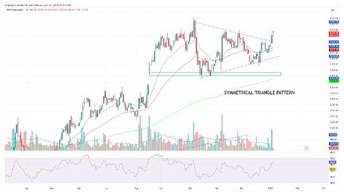 * UNO Minda Ltd has formed a Symmetrical Triangle pattern on the daily chart, indicating a potential bullish continuation setup. The stock has given a decisive breakout above the upper trendline, confirming strengthening price structure and continuation of the primary uptrend.