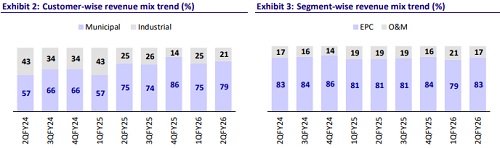 VA Tech Wabag (VATW) reported decent results in 2QFY26 as its revenue/adjusted EBITDA/PAT grew 19%/17%/20% YoY, 2-14% ahead of our estimates. Reported EBITDA declined 5% YoY, with a 10.7% EBITDA margin. However, adjusted to the forex gain of INR312m, which the company considers part of its continuing business, EBITDA margin stood high at 14.4%. In 1H, revenue/adj. EBITDA/PAT grew by a healthy 18%/17%/20% YoY. Adj. EBITDA margin stood at 13.8%, well within its guided range of 13-15%. Net cash position was maintained with INR5.6b at 1H-end (INR6.7b excluding HAM Projects).