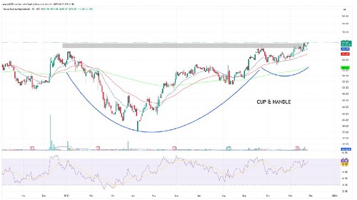 * The pattern was decisively broken with strong volume, confirming the breakout. Post breakout, the stock is showing strength and is currently trading above both the 50-day EMA and 200-day EMA, indicating a positive shift in trend.