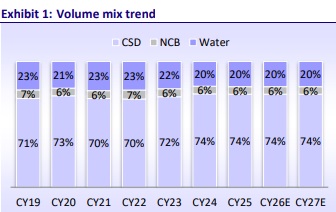 * The international market is currently growing faster than India and is increasingly driving incremental volumes, although margins remain lower than the mature India CSD market. The volume share of international business has increased to 31% in CY25E vs 18% in CY19. International volumes have grown in mid- to high?double digits in recent quarters, even as India has occasionally witnessed flattish quarters due to monsoons, competition, or base effects. We expect international volumes to sustain this volume share of ~31% by CY27.