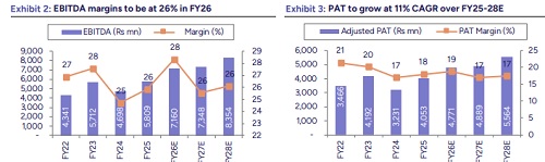 * EBITDAM expanded to 30.4% in Q2FY26: EBITDA increased 25.1% YoY and 4.8% QoQ to Rs1,673mn (PLe: Rs1,862mn). EBITDAM stood at 30.4% (PLe: 30.5%) as against a margin of 24.2% in Q2FY25 and of 29.5% in Q1FY26, 90bps sequential increase. Reported consolidated PAT was at Rs1,149mn (10.1% YoY/ 10.3% QoQ), while margins were at 21% vs 19% in Q2FY25, respectively.