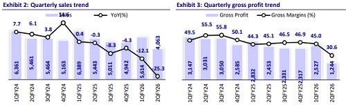 VIP Industries’ 2QFY26 print was below our estimates. Consolidated revenue declined 25.3% YoY and the company reported losses at the EBITDA/PAT level. The revenue decline was on account of 1) its focus on secondary sales by rationalizing trade discounting; 2) low uptick in BBD sales on e-com platforms as demand was skewed towards products owing to higher GST cuts, 3) lower trade discounting in MT/GT channels, and 4) lower realization. VIP cut its inventory by INR677m in 1H, and we expect to liquidate the remaining slow-moving inventory (INR250-300m) in the next quarter. In addition, VIP identified certain non-core assets (INR1.2b) for potential liquidation in the near term. With Multiples Private Equity acquiring a controlling stake, there is strong confidence in the brand’s revival potential. We expect the refreshed strategy to be anchored to 1) augmenting supply-chain efficiency with a focus on secondary sales, 2) enhancing employee productivity, 3) divesting low-profitability brands, 4) expanding its retail footprint to high-throughput locations, and 5) realigning ecommerce discounting.