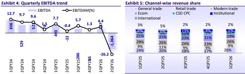 Gross margins fell to 30.6% (-1,445bp YoY), impacted by the INR550m soft inventory provisions taken in 2Q. We believe management opted for a one-time provision rather than increasing discounts on the e-commerce channel. EBITDA loss came in at INR1b, settling the EBITDA margin at -26.2% (-2578bp YoY) despite lower other expenses (-6.2%) and lower employee costs (-8.5%). In addition, VIP identified certain non-core assets (INR1.2b) for potential liquidation in the near term. With new management prioritizing inventory cleanup and reestablishing price discipline, we anticipate EBITDA to be under pressure in FY26
