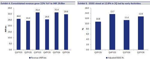 * Store expansion: The company’s total store count stood at 742 at the end of 2QFY26, with a retail area of 12.8mn sqft; out of the 25 stores added this quarter, 23 were in tier-3 cities, resulting in a 1% QoQ decline in average store size to 17.2K sqft as the average size of the new store opened was ~14.4K sqft. We note that East/South grew the fastest at 29%/27% YoY, buoyed by the early festive season and higher store expansion in the South. North, on the other hand, grew by only 15% YoY, while the West grew by 22% YoY.