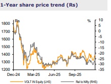We attended Voltas’s analyst meet, to gain deeper insight into its growth roadmap/demand environment. KTAs: 1) The management indicated prebuying activity ahead of the BEE rating changes wef 1-Jan-26 and inventories gradually depleting from 60 days (in Q2FY26) to 45 days (currently) vs 20-25 days (in Q3FY25). 2) The management flagged currency depreciation, elevated commodity costs, and the upcoming BEE norm transition as key variables that will influence pricing actions from Q4FY26. 3) Focus will remain on market share rather than margin. 4) UCP margin will remain sensitive to competitive intensity. 5) Beko continues to gain market share (a close #2 player in SAWM) and will expand distribution by leveraging its RAC distribution network. We expect growth/margin to rebound in FY27E (refer to our report ‘Untimely rain: Killjoy for AC demand, apt time to BUY AC stocks’). We maintain BUY on Voltas, with unchanged TP of Rs1,500, as valuations remain supportive (implied UCP P/S at ~3.6x, below the LTA) and expect earnings traction to improve as seasonality normalizes from H2