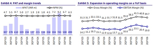 * Aided by strong operating performance, APAT increased 40% YoY to INR499m (in line). Capex stood at INR430m in 2QFY26.