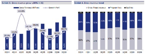 ? Growth momentum sustained: Zaggle continued its strong top-line growth momentum with 56% YoY (+22% QoQ) growth to reach INR 5.3bn on account of strong performance across segments. Software fees / Program fees / Propel platform revenue grew 25% / 56% / 58% YoY, driven by 1) addition of new clients and higher users per client, and 2) increased cross-selling and upselling. As of 3QFY26, company has 3,794 corporate customers (+14% YoY) with user base rising to 3.71mn (+17% YoY). Management noted that cross-selling (clients using 2 or more offerings) has improved further from 21% in 2Q. Management reiterated its guidance of 40-45% revenue growth (organic) for FY26 and expects standalone revenue to reach to ~ USD 1bn over the next 5-7 years with new offerings such as Zoyer, Fleet management, Zatix, ZIP contributing to growth.