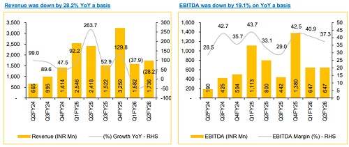 * Revenue for Q2FY26 down by 28.2% YoY & up by 9.7% QoQ at INR 1,736 Mn (vs CIE est. INR 1,740 Mn)