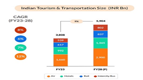 The Indian Travel and Tourism Market is expected to grow at 9% CAGR till FY28, with Air being the fastest growing at 12% followed by buses, hotels and then the already enormous rail.