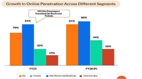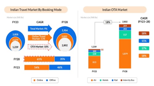 India’s total travel market is projected to grow at a 9% CAGR through FY28, while the online segment is expected to expand faster at a 13% CAGR. The share of online bookings is also expected to increase meaningfully, from 54% in 2023 to 65% by FY28, gradually eating into the offline segment.