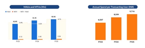 Notably, as seen in the table above, Ixigo’s Monthly Active Users (MAU) have grown from 63 million in FY23 to 82 million in FY25. Its Monthly Transacting Users (MTU) also rose from 2.13 million to 3.34 million over the same period. The benefits of cross-selling across its ecosystem are clearly visible, with annual spend per transacting user increasing from 6,537 to 9,716 in the last two years.