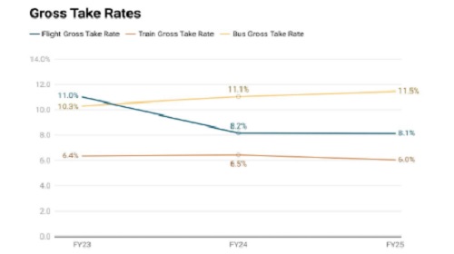Now, coming to take rates. Ixigo’s flight business take rates have declined from 11% in FY23 to 8.1% in FY25. The management attributes this to deliberate steps taken over the past few years to become more competitive and gain market share. This included lowering convenience fees, offering customer incentives, and reducing pricing on value-added services, all of which weighed on per-transaction margins.