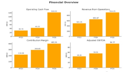Operating leverage has clearly begun to show, with operating cash flows jumping 182% YoY to 122 Cr in FY25. Contribution margin and adjusted EBITDA have also scaled well, growing at ~36% and ~46% CAGR respectively over FY23–FY25.