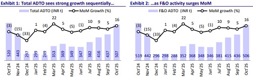 * Total ADTO grew 16% MoM in Oct’25 to INR507t, driven by 16% MoM growth in notional F&O ADTO to INR506t.