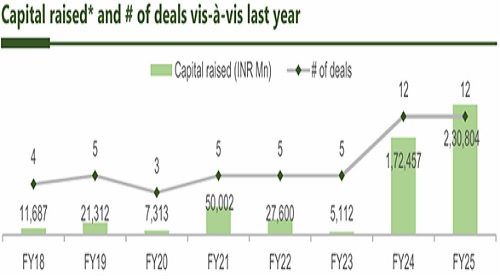 Equirus Capital – Mumbai based full-service investment banking firmhas released a press note on thedevelopment in the real estate sector. As per the press note, the capital raised are at a 7-year high at Rs 23,080 crores, the number of deals were 12. Category wise the total fund raised since FY18 was Rs 72,331 crore, out of which largestcomposition was that of REITs at Rs 31,241 crore, large cap real companies raised Rs 20,437 crores,midcap at 12,496 crores, and smallcap real estate companies stood at Rs 8156 crores.