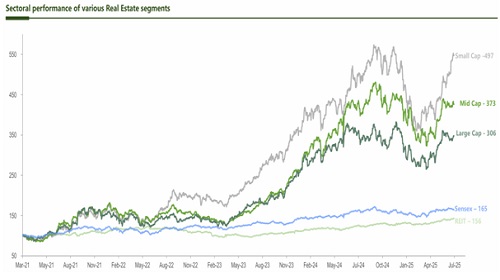 Small Cap real estate stocks are the best performing segment since March 2021 followed by Mid Cap. Larcap real estate stocks’ performance has been lower than mid and smalcap realty stocks. REITs have been the lowest performing equity instrument in the real estate universe.
