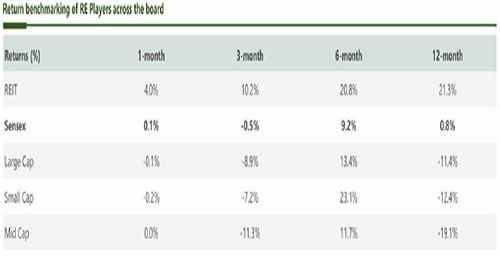 However, if we see returns from a 12-month perspective, REITs have been the best performing real estate asset class, the returns garnered have been 21.3%, Large, mid and small cap real estate stocks have posted negative returns in the past 12 months.