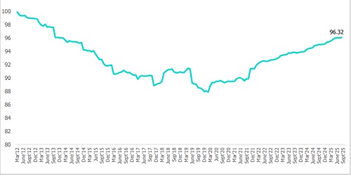 The CareEdge Debt Quality Index (CDQI) has witnessed upward trend since November 2021. The index slightly dipped to 96.32 in October 2025 vis-a-vis 96.43 in September 2025 due to the reduction in rated amount in the higher rated categories.
