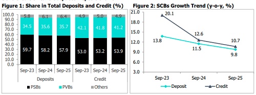 As of September 30, 2025, credit outstanding stood at Rs 189.8 lakh crore, up 10.7% y-o-y, compared with 12.6% (including merger impact) in Q2FY25. As of September 2025, PSBs have gained market share in total credit, accounting for 53.9%, compared with 41.2% for PVBs. This increase in PSBs' share comes amid stable CD ratios for PSBs as compared to PVBs, which enabled greater lending headroom in the current quarter. The slowdown in overall credit offtake compared to the previous year was primarily driven by a slowdown in NBFC credit growth, which dropped sharply from 9.5% in Q2FY25 to 3.9% in Q2FY26. Credit growth in the personal loan segment declined significantly, decelerating to 11.7% in Q2FY26 from 13.4% a year earlier. As of September 30, 2025, outstanding deposits totalled Rs 235.4 lakh crore, reflecting a y-o-y growth of 9.8% wherein term deposits grew by 11.3% y-o-y, outpacing CASA's growth rate of 7.4% Meanwhile, PVBs achieved a double-digit growth of 10.2% outpacing PSBs, which grew at a single-digit growth of 9.2%.