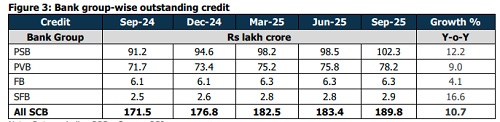 * PVBs reported a slower growth as compared to PSBs, reaching 9.0% y-o-y in Q2FY26, moderating from 11.9% in the previous year. Credit growth in PVBs is primarily driven by strong demand for MSME loans, growth in the vehicle finance segment, and lending to higher-rated corporates. In absolute terms, PVBs’ credit expanded by Rs 6.5 lakh crore, reaching Rs 78.2 lakh crore.