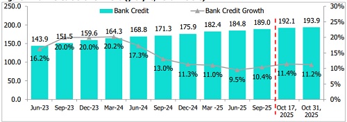 * As of October 31, 2025, total credit off-take rose to Rs 193.9 lakh crore, up 11.2% year-on-year (y-o-y). Festive-season demand, GST rate cuts, sustained retail and MSME activity, and some corporate borrowing amid rising bond yields all contributed to the increase. Strong vehicle financing during the festive period is also expected to aid credit growth further. Meanwhile, this growth was lower than the 11.8% growth in the same period last year due to weaker corporate demand and reduced lending to certain segments.