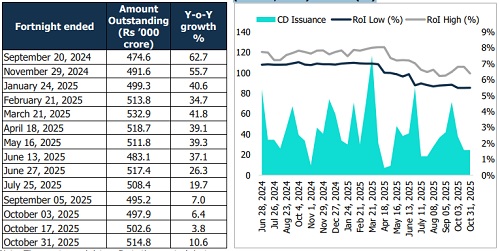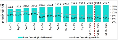 • As of October 31, 2025, aggregate bank deposits stood at Rs 241.7 lakh crore, registering a 9.7% y-o-y increase and a 1.2% rise over the previous fortnight. Despite the sequential improvement, deposit growth continued to trail the 11.0% (ex-merger) expansion recorded a year earlier, attributed to investments into alternative avenues yielding higher returns. The latest fortnightly uptick was supported largely by a rise in demand deposits, which grew 21.0% y-o-y, higher than the 12.0% growth seen a year ago, driven by festive season business collections. Demand deposits now stand at Rs 31.0 lakh crore, accounting for 12.8% of total deposits. Meanwhile, time deposits, which form 87.2% of the deposit base, expanded by 8.2% y-o-y to Rs 210.7 lakh crore, moderating from 11.8% in the corresponding period last year.
