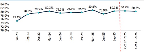 • The credit-to-deposit (CD) ratio eased slightly to 80.2% in the fortnight ending October 31, 2025, though it continued to stay above the 80% mark. The slight moderation was driven by a stronger increase in deposits, which rose by Rs 2.91 lakh crore during the fortnight, compared with a smaller rise in credit offtake of Rs 1.8 lakh crore. The relatively higher deposit accretion diluted the pace of credit expansion, resulting in a mild softening of the CD ratio.