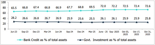 • The bank credit-to-total-assets ratio inched up by two basis points to 72.6% in the fortnight ending October 31, 2025. In contrast, the government investment-to-total-assets ratio eased slightly to 25.8%. Total government investments stood at Rs 68.9 lakh crore, reflecting a 5.1% y-o-y increase and a modest sequential rise of 0.1%.
