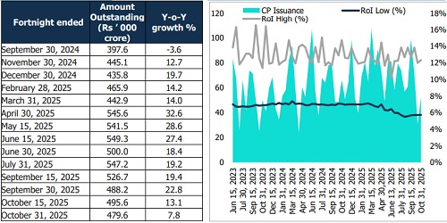 • Bank credit off-take rose 11.2% y-o-y to Rs 193.9 lakh crore as of the fortnight ending October 31, 2025, marking a 0.9% uptick over the previous fortnight. The improvement was fuelled by festive-season demand, the boost from recent GST rate cuts, and sustained traction in the retail and MSME segments. Corporate borrowing also picked up amid elevated bond yields. Strong vehicle financing during the festive period is expected to provide additional support to overall credit growth in the near term.