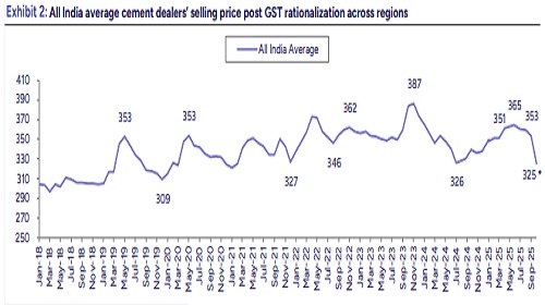 Seasonal weakness in cement realization: Realizations for our cement coverage universe are expected to decline by ~2.2% QoQ (+4.9% YoY) in Q2FY26, impacted by weak demand during the monsoon season and the GST rationalisation. Pricing remained steady in July but softened in August due to rains and remained flattish in September, as per our channel checks. On an average, cement prices declined by ~2% QoQ, with the steepest correction of ~4% QoQ in the East, ~3% QoQ in the South and ~2% the West. The North and Central regions’ prices were flattish QoQ. Going forward, we expect realizations to remain steady in the near term, with recovery likely post-festive season in Q3FY26. GST rationalization could play as spoilsport and restrict companies from taking price hikes in the near future.