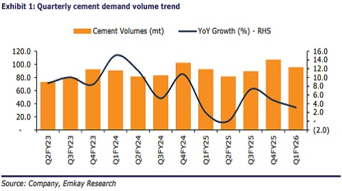 Checks suggest early single-digit YoY growth on pan-India basis in Q2FY26. Regionally, except North and Central India, each region reports flat (with positive bias) YoY volume growth. North and Central India should report a mid-single-digit growth rate, as key cement-consuming states of Rajasthan and Uttar Pradesh are expected to perform better due to lower rainfall YoY vs other regions/states. Post the GST rate cut, there has been no tangible pick-up in demand due to the festive period coupled with flooding in various parts of the country. Channel checks reveal offtake would improve from mid-Q3FY26.