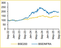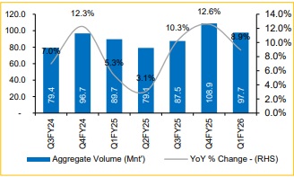 Strong YoY growth in volumes underpins sector: In Q1FY26, cement companies under our coverage delivered a healthy 8.9% YoY volume growth, driven by strong infrastructure spending. Among the major players, ACEM posted the highest growth at 16.7% YoY, followed by UTCEM at 15.0% YoY and JKCE at 14.3% YoY. We expect this growth momentum to continue through FY26, further supported by the GST rate cut. That said, Q2FY26 volumes could witness some moderation sequentially due to the impact of monsoons.