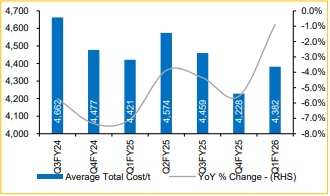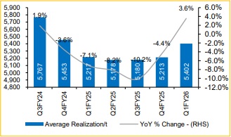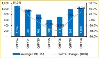 EBITDA/t sees strong YoY rebound: In Q1FY26, EBITDA/t for our coverage companies registered a strong 225/t YoY recovery and rose 36/t QoQ, reaching an average of INR 1,020/t compared to INR 985/t in Q4FY25. The improvement was driven by higher realizations, operating leverage benefit due to higher volume and cost efficiency. Going forward, continued focus on cost-reduction initiatives is expected to support further EBITDA/t gains to different extent for different companies.