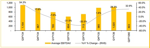 In Q2FY26E, we expect average EBITDA/t for our coverage universe to reduce to INR 803/t, down from INR 1,020/t in Q1FY26. This decline is primarily impacted by a pan-India decline in cement prices, demand affected because of irregular monsoon and festive season, additional expenses of plant maintenance, and the freight expenses have increased on US Pet coke price owing to tariffs.