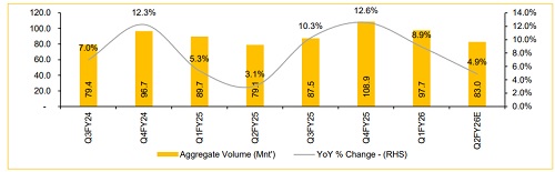 In Q2FY26E, we expect cement stocks under our coverage (11 companies) to report a 4.9% YoY volume growth, while volume may decline by 15.2% QoQ due to irregular monsoon and festive season. Overall, volume growth in Q2FY26E is expected to be weak. But, for the full year, it is anticipated to remain robust across major cement players, driven by improved demand visibility supported by GST rate cuts and stronger execution of cement companies' expansion plans. A key catalyst is the sharp rise in state government capex plans for FY26E—up 35% in West Bengal to INR 393Bn, +18% in Jharkhand to INR 226Bn, and +40% in northern states to INR 537Bn—which is boosting infrastructure activity and construction demand on the ground, particularly in the East and North regions.