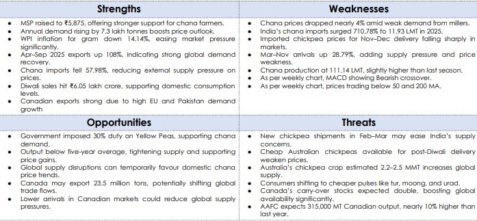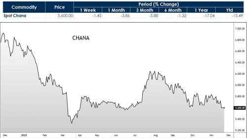Macro & Policy Drivers: The 30% duty on yellow peas continues to support chana demand by restricting cheaper alternatives. Consumption trends remain favorable, backed by strong festive spending and a shift toward domestic pulses. Global supply disruptions and lower Canadian arrivals could further improve price sentiment in coming months.
