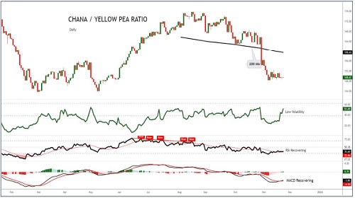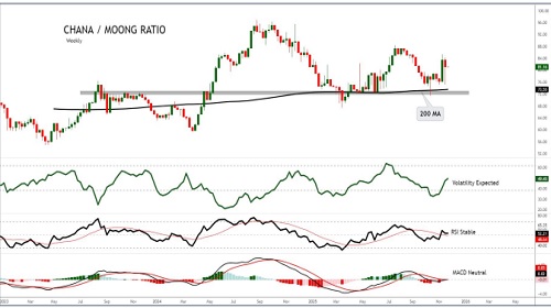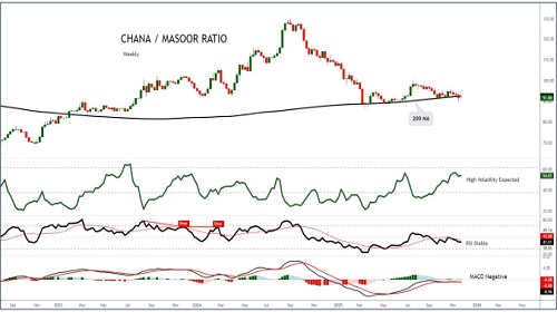 Macro & Policy Drivers: The extension of duty-free yellow pea imports until March 2026 and weak global pulse prices have reduced India’s export competitiveness. Shift in consumption toward cheaper pulses like tur, moong and urad adds further demand-side pressure on Chana, keeping market sentiment bearish.