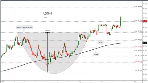 Looking at the Daily Chart, USDINR has been moving steadily higher after completing a rounding bottom pattern, and the price recently jumped toward the 89.16 area, showing strong bullish momentum. In my view, the trend still appears positive as long as the pair holds above key support zones, and volatility has picked up slightly, which traders should be aware of.