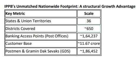 This extensive physical and human infrastructure positions IPPB as one of the largest distribution platforms for financial services in the country, with the ability to reach customers well beyond the scope of traditional banking channels.