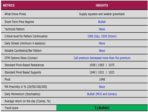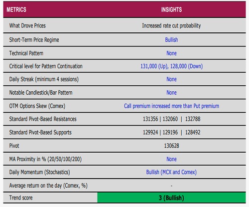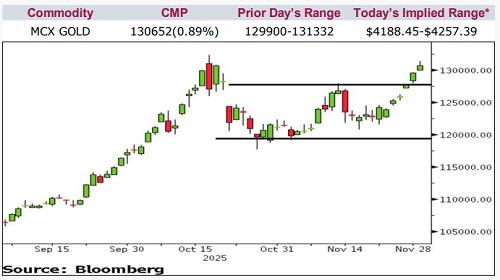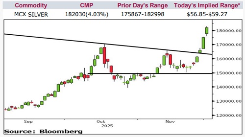 * Comex Silver extended its winning streak for the fifth consecutive session, gaining nearly 3% and marking a fresh 52-week high at $58.84. Improved rate-cut odds and a sharp drop in inventories at SHFE-linked warehouses—now near decade-low levels—have reinforced the positive bias at lower levels