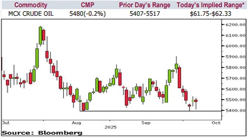 * Nymex Crude Oil rose by over 0.5% after a modest output hike by OPEC+, which helped stabilise prices at lower levels. Persistent supply concerns linked to the Russia–Ukraine conflict also lent support. Market participants now await the U.S. inventory data due later today, which could trigger a directional move depending on the outcome
